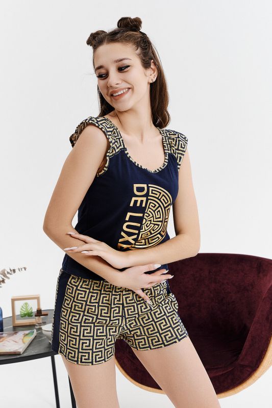 The set consists of a T-shirt and shorts. T-shirt in a semi-fitted silhouette, with a rounded neck, on wide straps made of finishing cloth. The neck and armholes are treated with a finishing cloth label. Shorts are straight, short, with an elastic band, with stripes along the side seams.